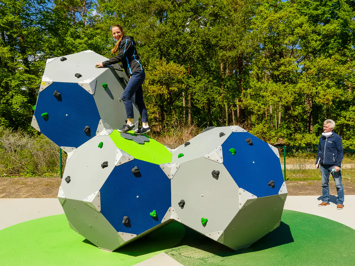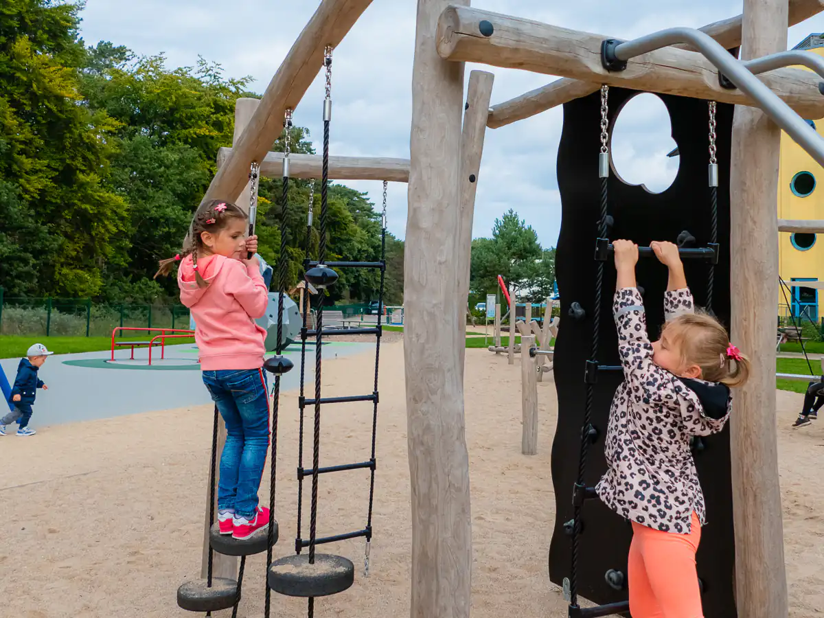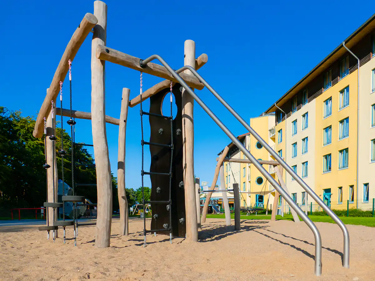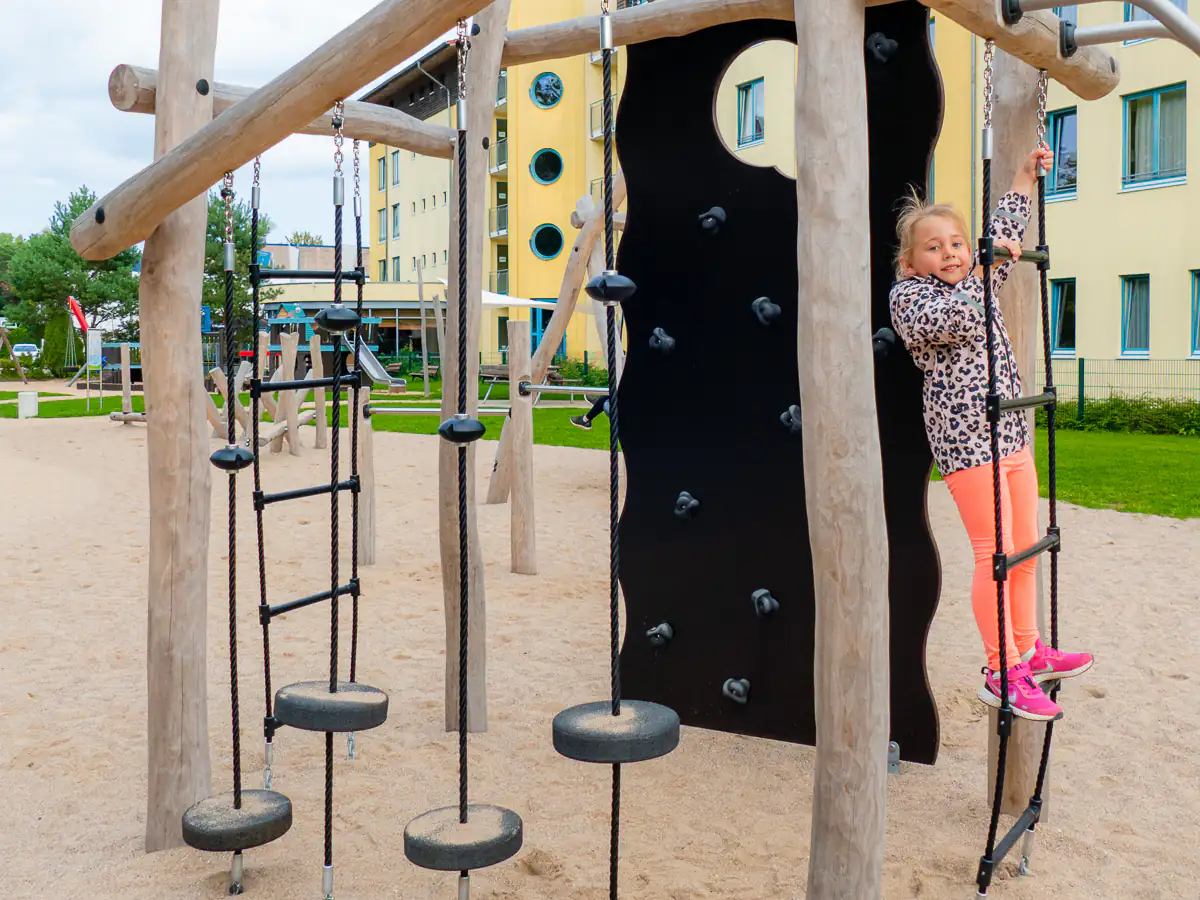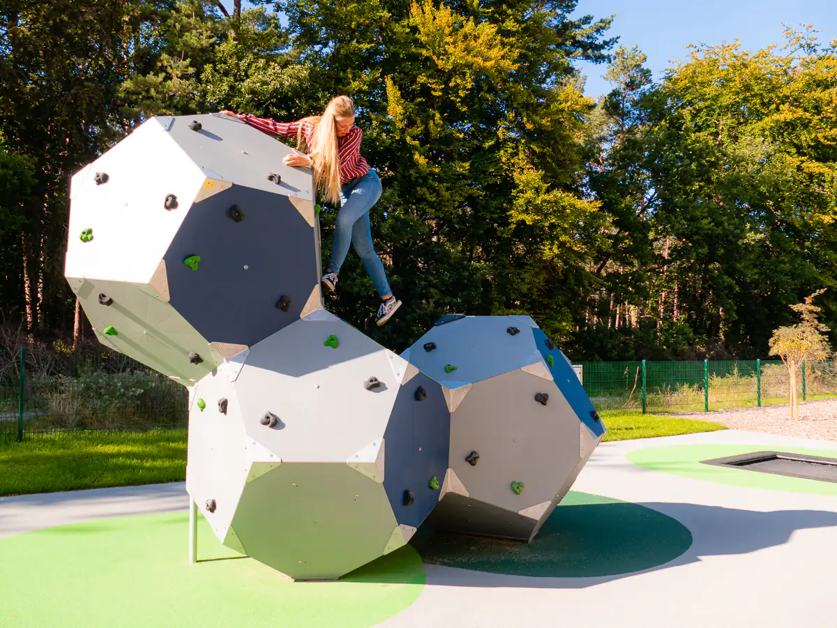 Kinder zwischen 6 und 12 Jahren können auf der VIERECK-KLETTERANLAGE balancieren, die Netze hochhangeln und Leitern sowie Pfähle erklimmen und dabei Ausdauer, Kraft und Geschicklichkeit an der integrierten Kletterwand testen.