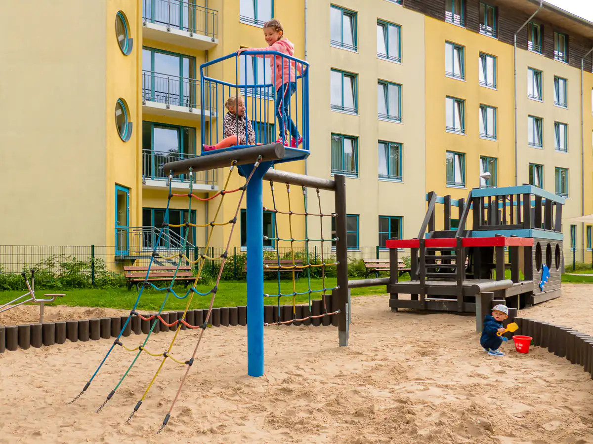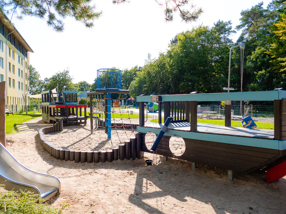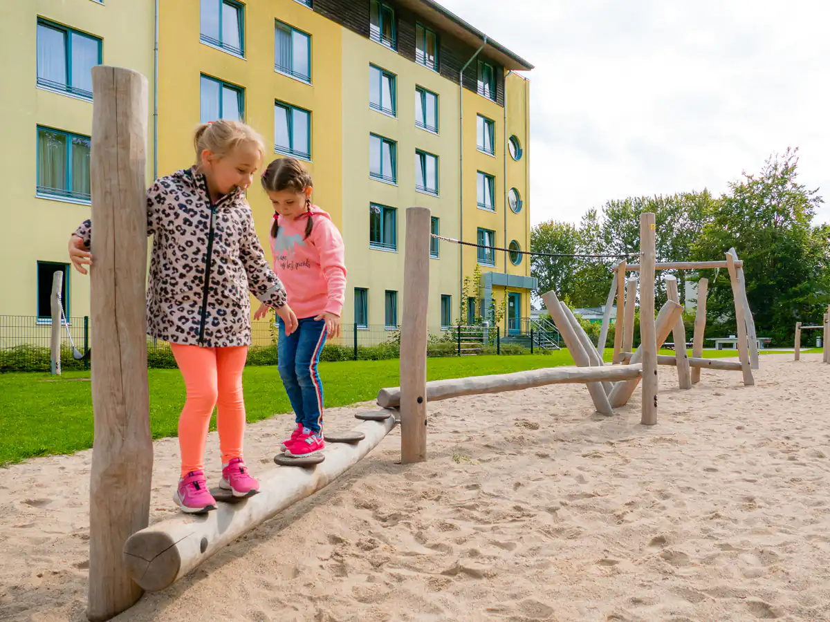 Der multifunktionale Außenspielplatz mit verschiedenen Stationen und Parcours für ganz viel Freizeitspaß im Casa Familia.
